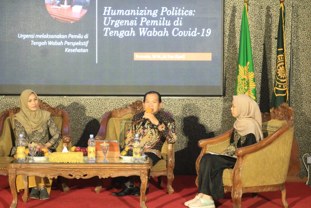 Ada dua narasumber yaitu Rusnoto, SKM.,M.Kes (Epid), ia membahhas tentang urgensi pelaksanaan Pemilu ditengah Wabah Covid-19 perspetif kesehatan. Narasumber kedua yaitu Naily Syarifah, S.Psi, beliau membahas tentang Design Pilkada yang Luber, Jujur, Demokratis, dan Aman dari Covid-19. Dan seminar ini di moderator oleh Naili Azizah, SH.,MH selaku urusan humas dan kerjasama Universitas Muhammadiyah Kudus.